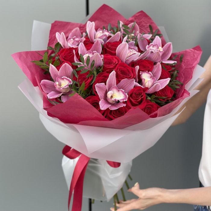 Букет Бурж с красными розами и цимбидиумом