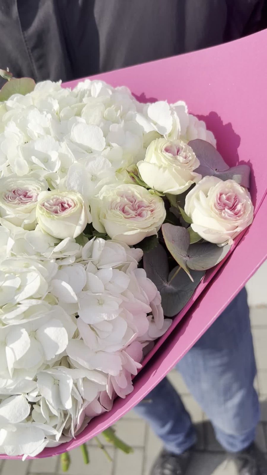 Букет гортензий с пионовидными розами и эвкалиптом