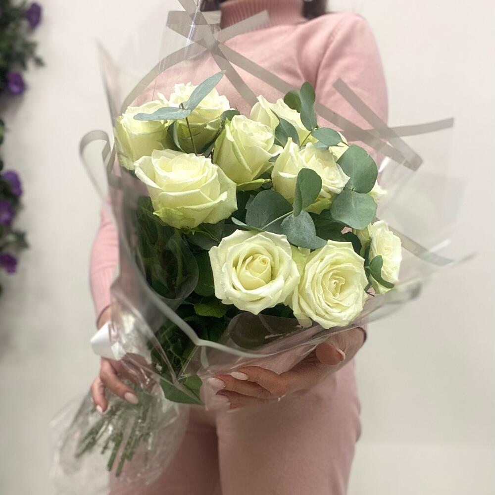 Букет из 11 роз и эвкалипта