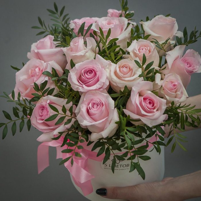 Роза розовая – 15 шт.Шляпная коробка – 1 шт.