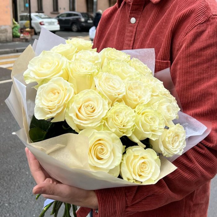 белая роза мондиаль – 19 шт.Упаковка дизайнерская – 3 шт.Лента атласная белая – 1 шт.