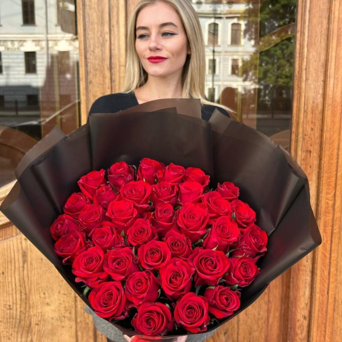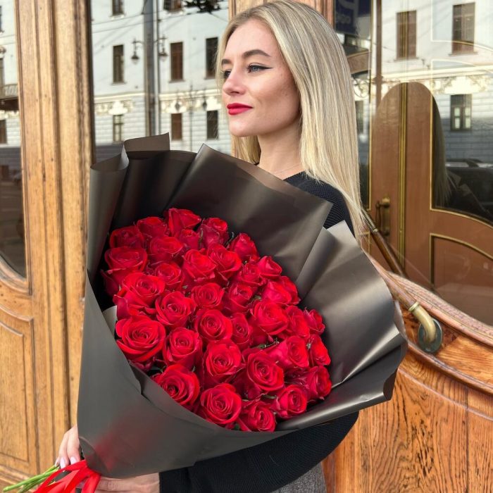 Роза красная 60 см – 35 шт.Дизайнерская упаковка – 5 шт.Лента атласная – 2 шт.
