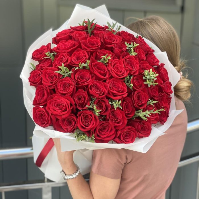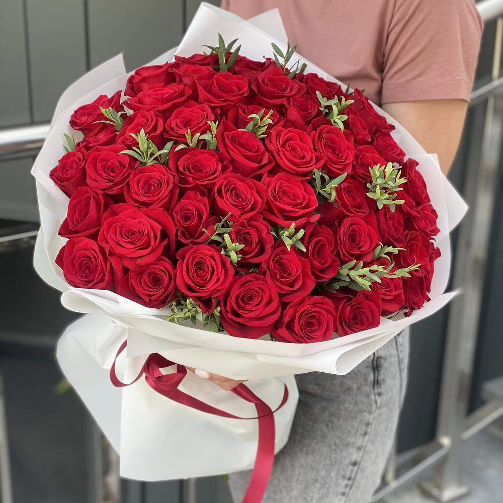Букет из 51 красной розы и эвкалипта
