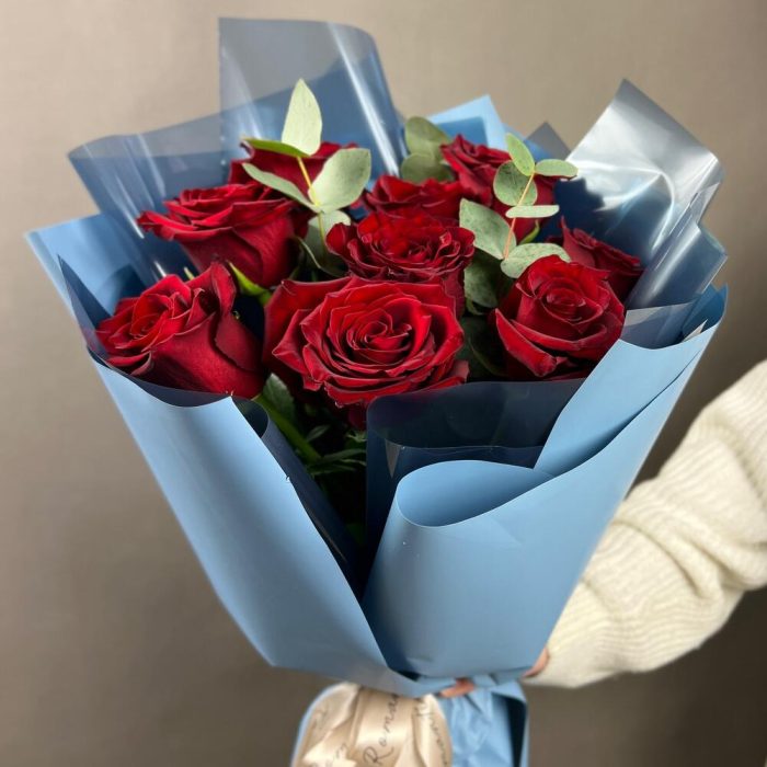 Эвкалипт – 3 шт.Лента атласная – 2 шт.Пленка матовая – 5 шт.Роза эксплорер 50 см – 9 шт.пленка полупрозрачная – 4 шт.