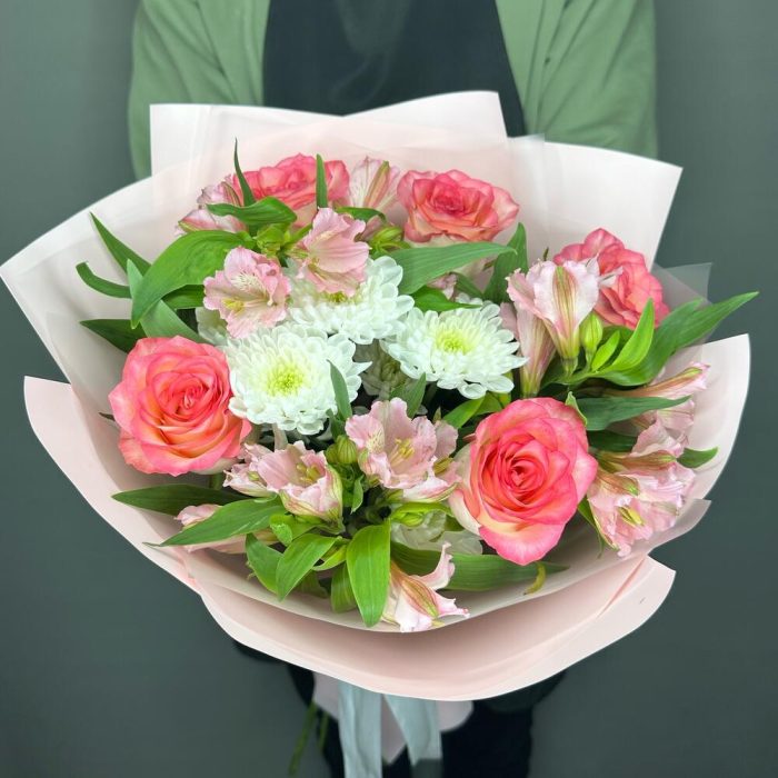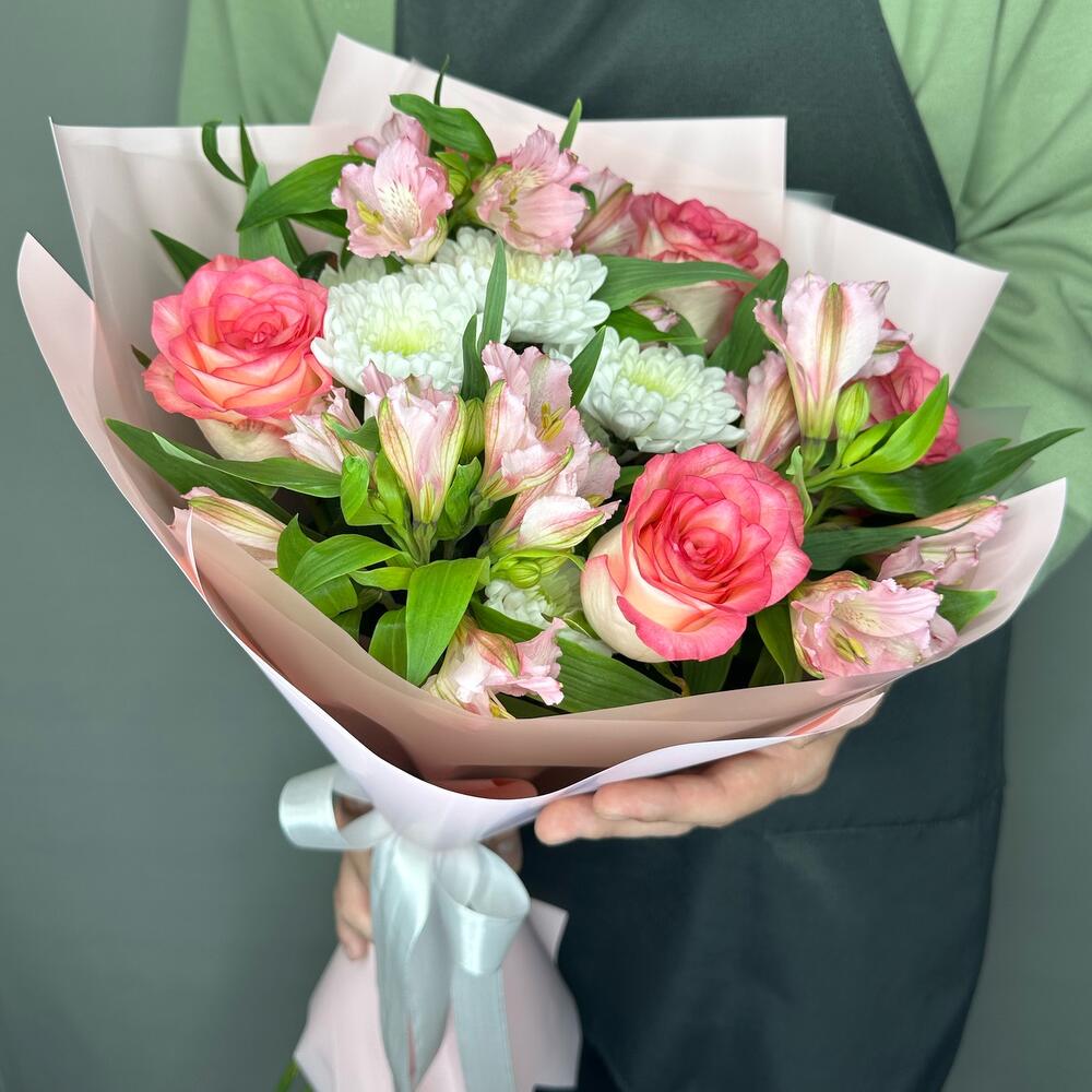 Альстромерия – 3 шт.Хризантема кустовая – 1 шт.Лента атласная – 1 шт.Упаковка дизайнерская – 1 шт.Роза одноголовая эквадор 50 см – 5 шт.