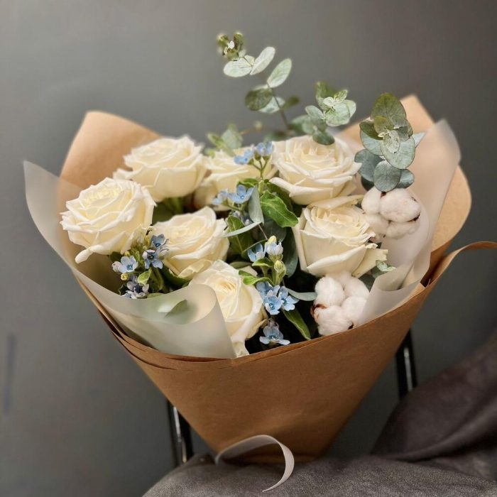 Хлопок – 3 шт.Роза одноголовая – 7 шт.Оксипеталум – 3 шт.Упаковка дизайнерская – 1 шт.зелень декоративная – 2 шт.