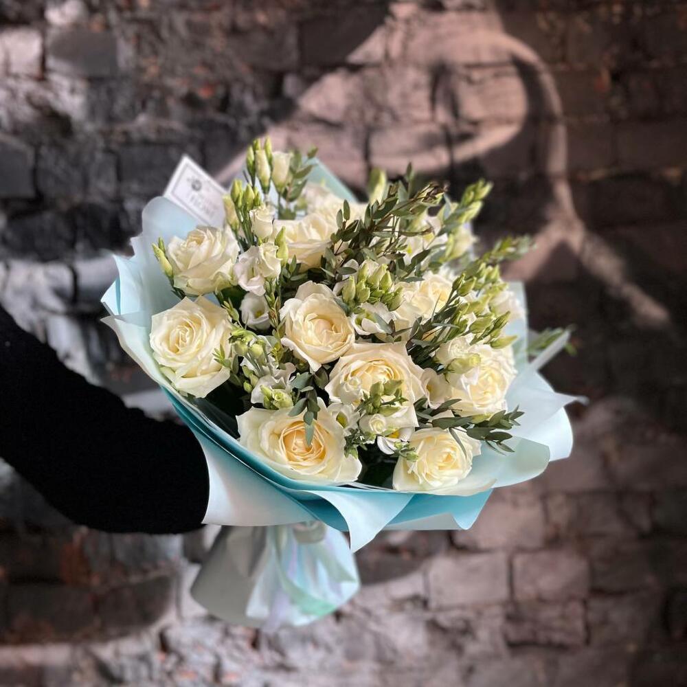 Букет из белых роз, эустомы и эвкалипта в стильной упаковке “Белый блюз”