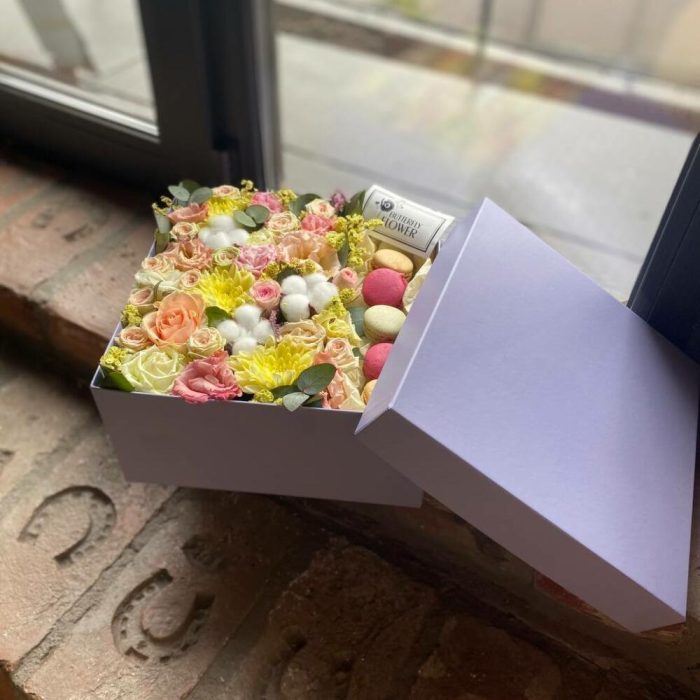 Букет из цветов и макаронс в декоративной коробке “Сладкое солнце”