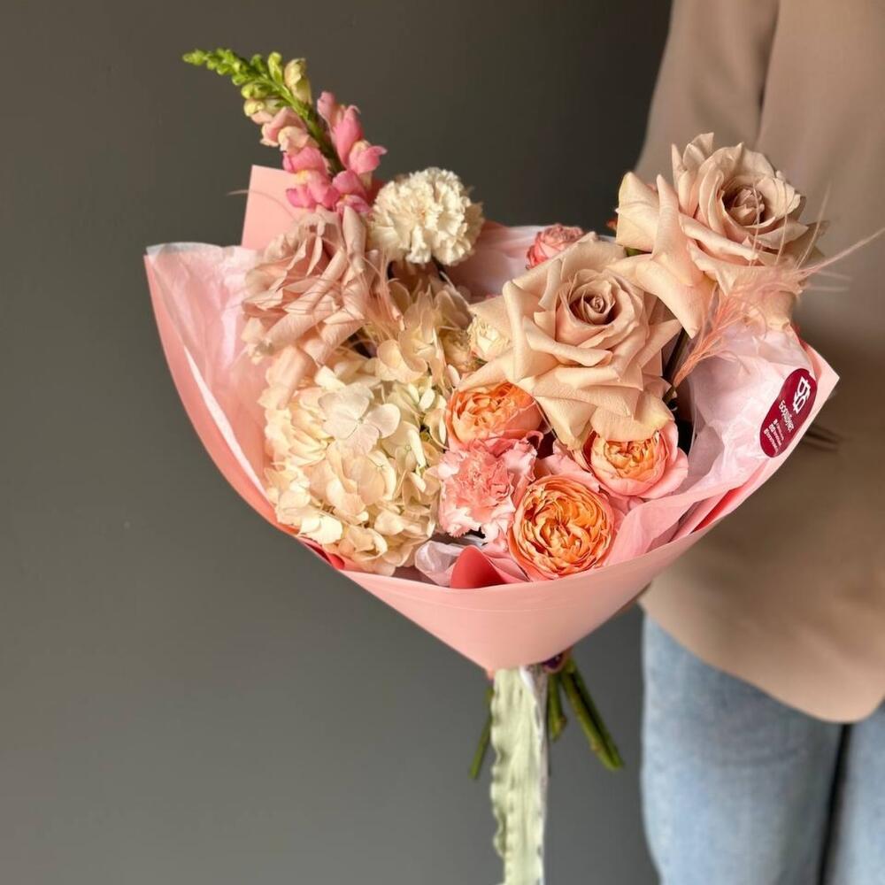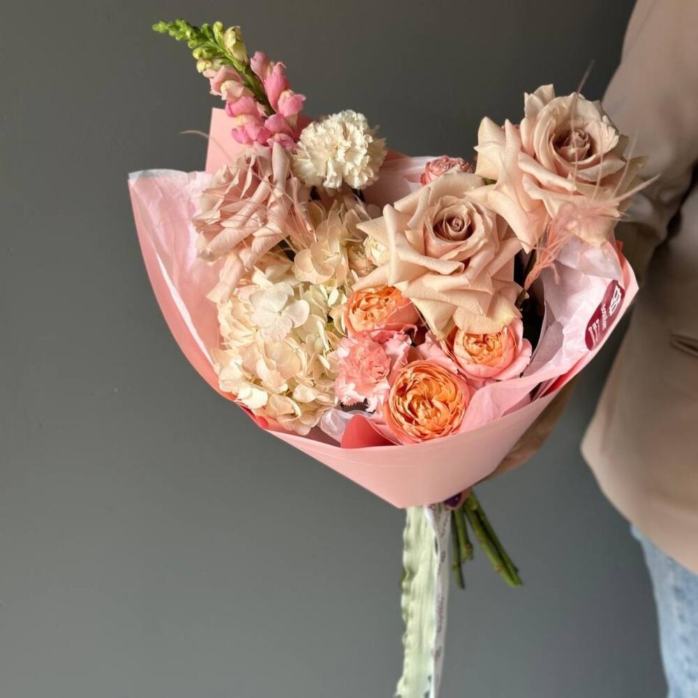 антиринум – 1 шт.Кустовая роза Бомбастик – 1 шт.Диантус – 2 шт.Сухоцветы – 2 шт.Упаковка дизайнерская – 1 шт.Гортензия розовая – 1 шт.роза квиксенд – 3 шт.джульетта кустовая роза пионовидная – 1 шт.
