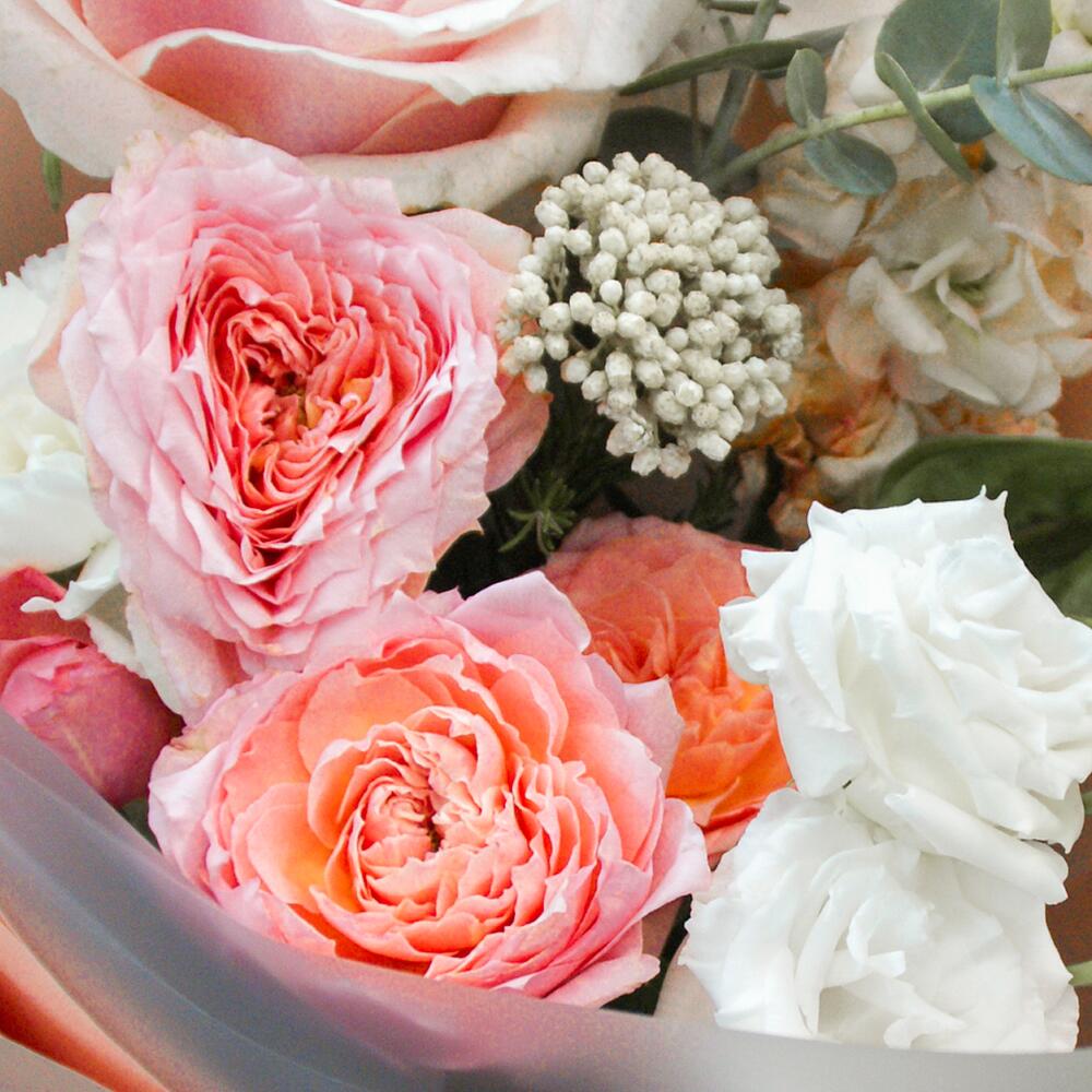 Букет из французской розы, эустомы, маттиолы и кустовой пионовидной розы Джульетта с эвкалиптом