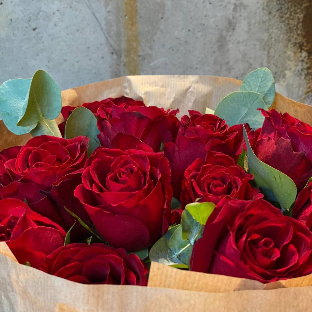 Роза одноголовая – 11 шт.Эвкалипт – 1 шт.Подарочная упаковка – 1 шт.средство для продления жизни срезанных цветов – 1 шт.
