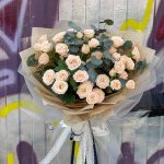 Эвкалипт – 2 шт.Кустовая роза – 11 шт.Лента атласная – 2 шт.Упаковка дизайнерская – 2 шт.