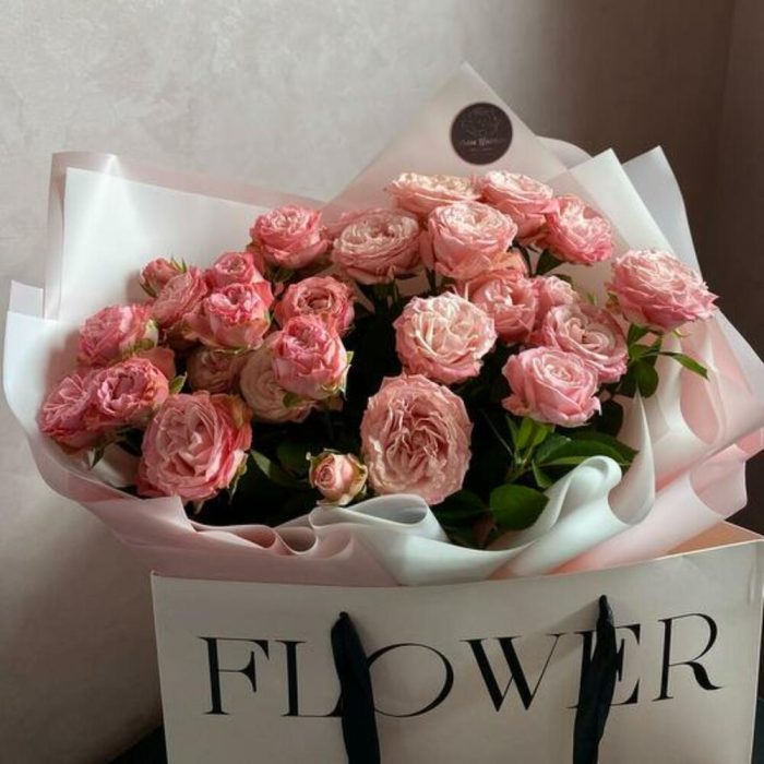 Атласная лента – 1 шт.Роза кустовая пионовидная – 9 шт.Дизайнерская упаковка – 1 шт.