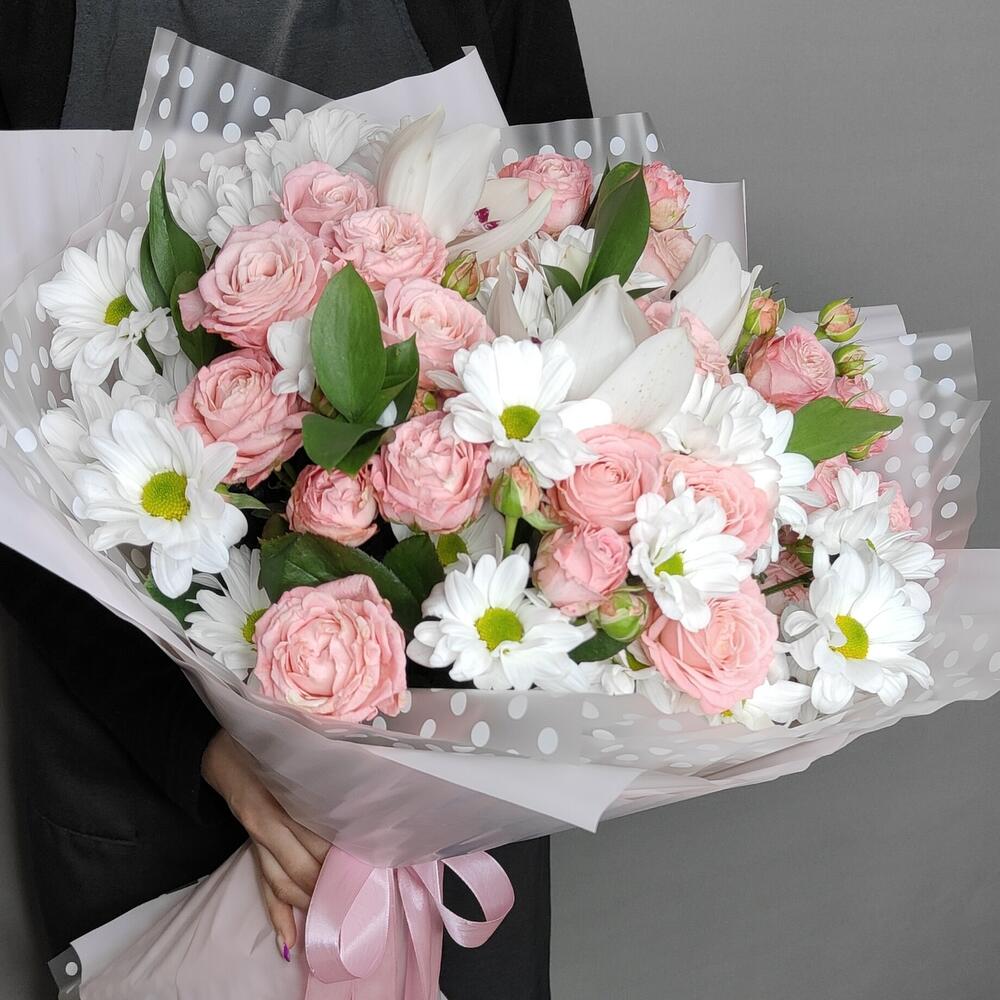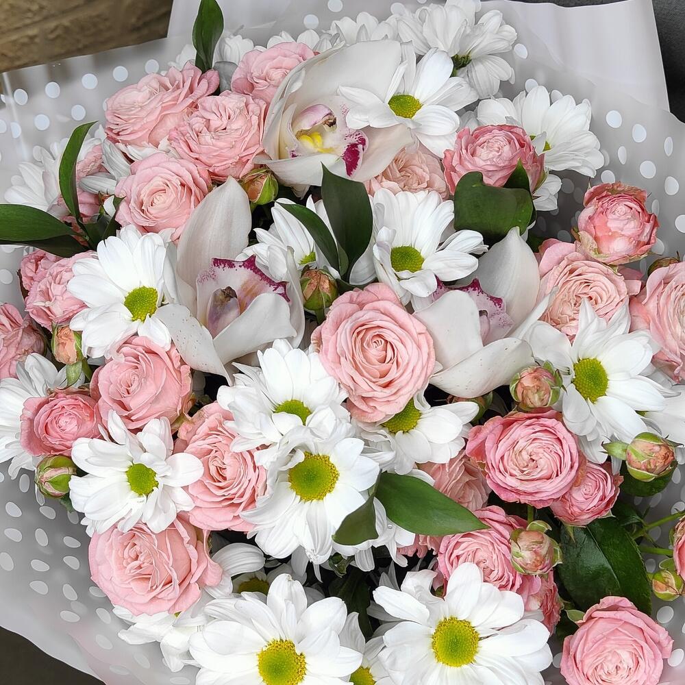 Роза кустовая – 5 шт.Рускус – 5 шт.Лента атласная – 1 шт.орхидея – 3 шт.Упаковка дизайнерская – 1 шт.Хризантема Ромашковая – 5 шт.