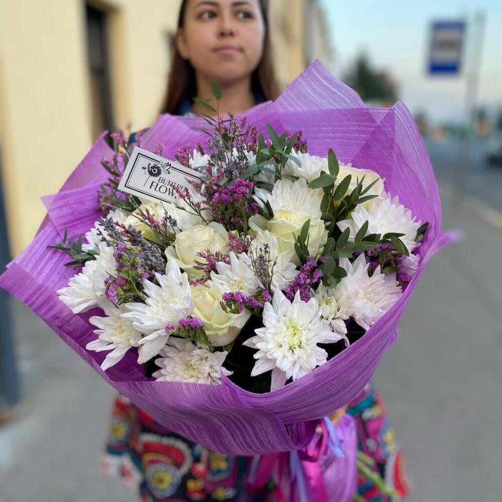 Лаванда – 20 шт.Хризантема кустовая – 6 шт.Роза – 7 шт.Лимониум – 3 шт.Эвкалипт – 2 шт.Статица – 2 шт.Упаковка – 2 шт.