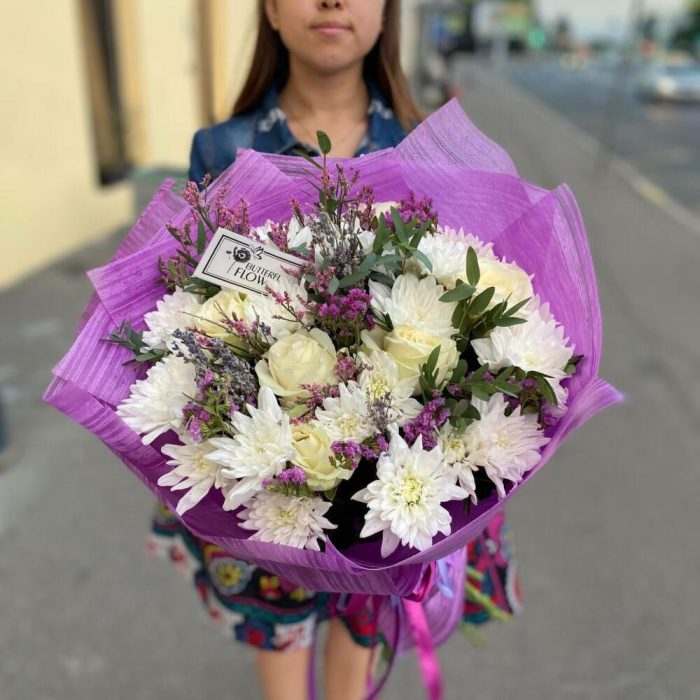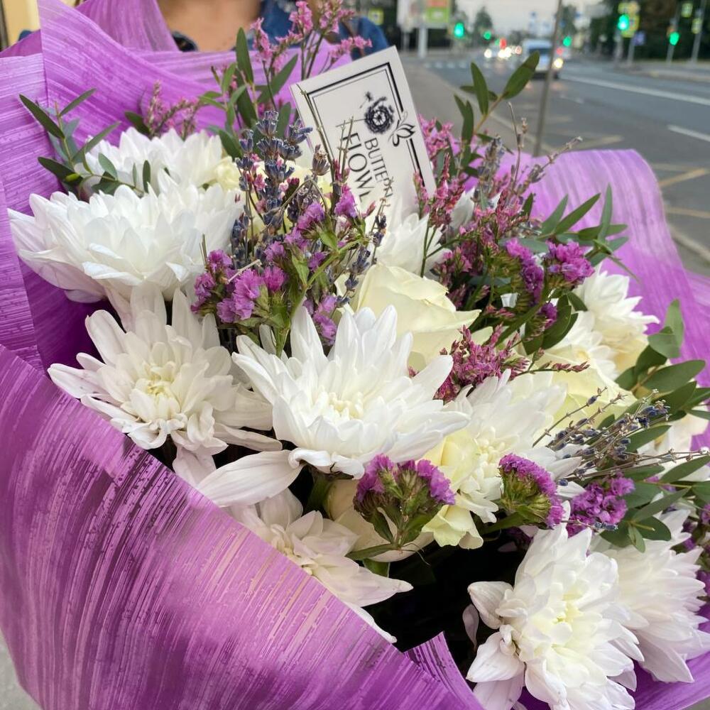 Букет из лаванды, кустовых хризантем, роз, лимониума, статицы и эвкалипта в стильной упаковке “Сендлер”