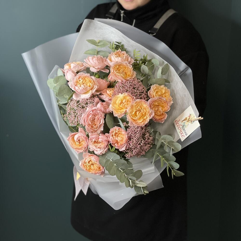 Лента – 1 шт.Эвкалипт – 2 шт.Фисташка – 3 шт.Упаковка дизайнерская – 2 шт.Роза Джульетта – 5 шт.озотамнус сухоцвет – 3 шт.