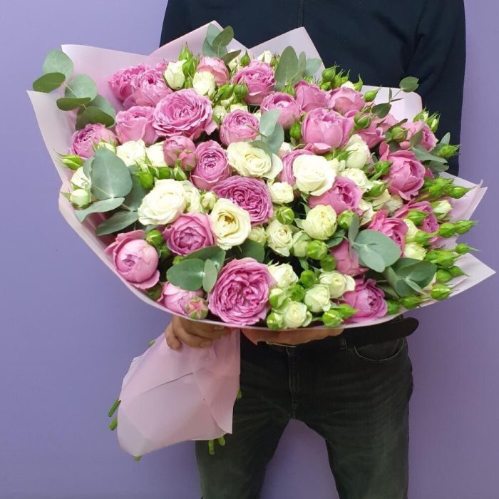 Роза пионовидная кустовая – 11 шт. Роза кустовая белая – 19 шт. Эвкалипт – 5 шт. Упаковка дизайнерская – 3 шт. Открыточка с вашими пожеланиями – 1 шт.