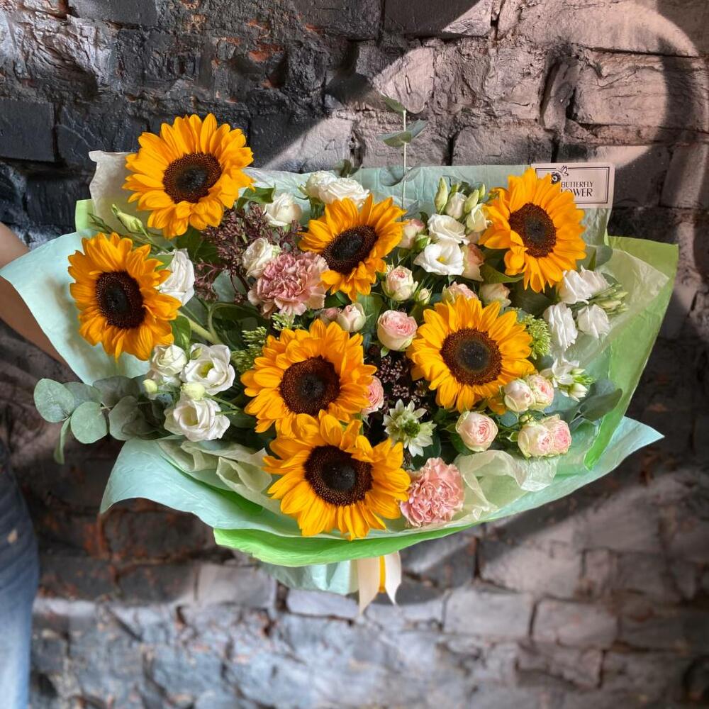 Категорий: Гвоздики, Кустовые розы, Лизиантусы, Пионовидные розы, Подсолнухи, Розы