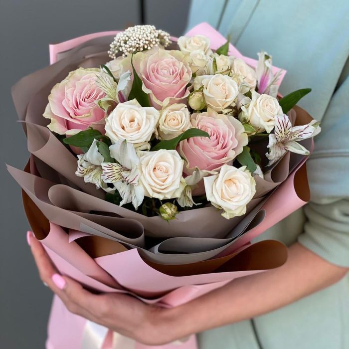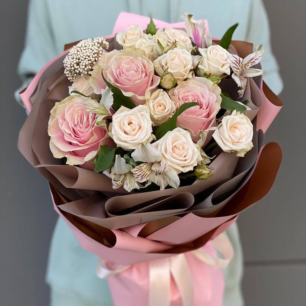 букет из кустовых и одноголовых роз, альстромерии и озотамнуса в оформлении!