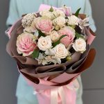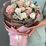 кустовая роза порцелина – 3 шт. Альстромерия – 2 шт. Роза пинк мондиаль – 3 шт. Озотамнус – 1 шт. Оформление – 1 шт.