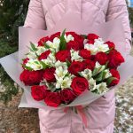 Роза красная – 25 шт.Альстромерия – 7 шт.Пленка матовая – 2 шт.