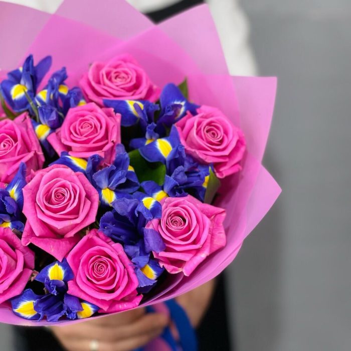 аква роза – 10 шт.Ирис – 9 шт.Рускус – 10 шт.Упаковка дизайнерская – 3 шт.Лента атласная – 1 шт.