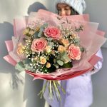 Гипсофила – 3 шт.Роза кустовая – 5 шт.Эвкалипт – 3 шт.Лента атласная – 2 шт.Тишью – 2 шт.Роза пионовидная – 3 шт.Упаковка дизайнерская – 3 шт.