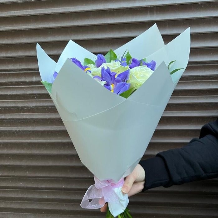 Ирис – 8 шт.Зелень – 8 шт.Роза белая – 5 шт.корея пленка – 1 шт.