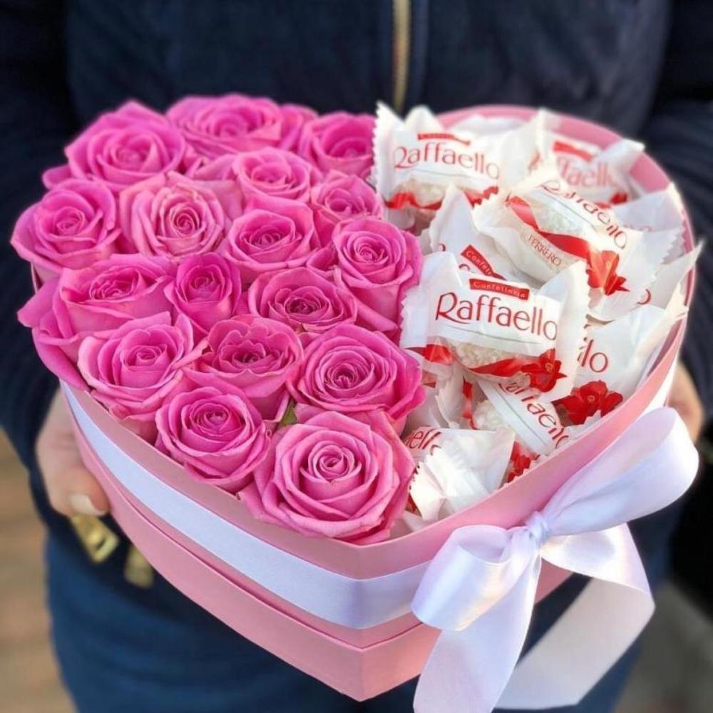 Букет из розовых роз и конфет Рафаэлло в декоративной коробке-сердце “С любовью и теплом”