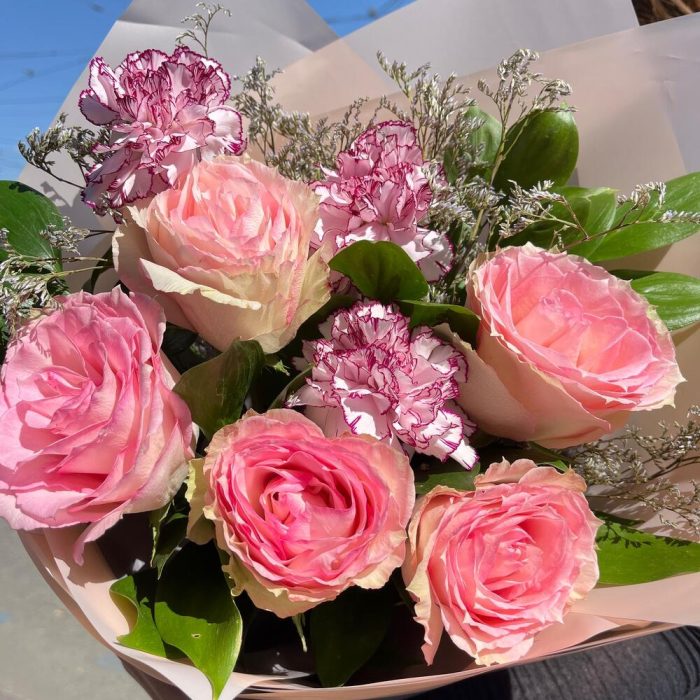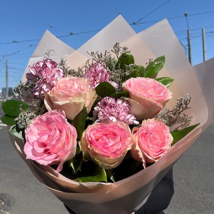 Роза – 5 шт.Диантус – 3 шт.лимониму – 3 шт.Рускус – 3 шт.Упаковка дизайнерская – 4 шт.лета – 2 шт.