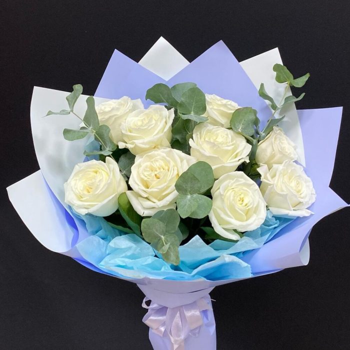 Эвкалипт – 4 шт. Лента атласная – 4 шт. Упаковка дизайнерская – 4 шт. Роза Мондиаль – 9 шт. Слюда упаковка – 2 шт.
