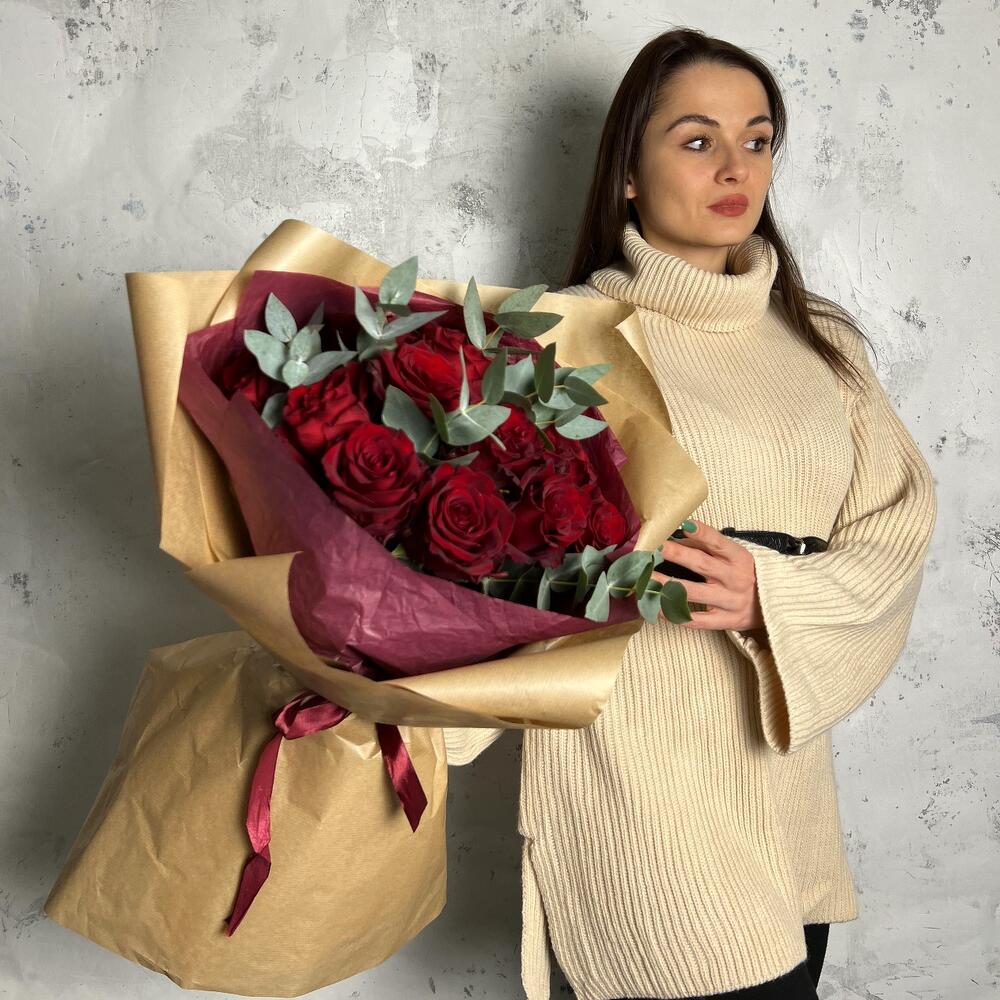роза эваадор 60 см – 15 шт.Эвкалипт – 5 шт.Упаковка дизайнерская – 3 шт.Лента атласная – 1 шт.