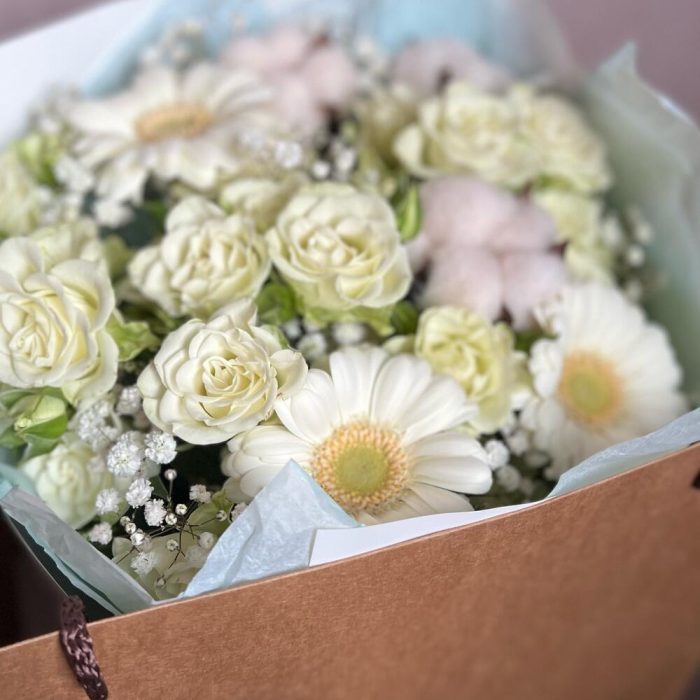 Кустовая роза – 5 шт.Гипсофила – 1 шт.Гербера – 3 шт.Хлопок – 3 шт.декоративная упаковка – 1 шт.Атласная лента – 1 шт.