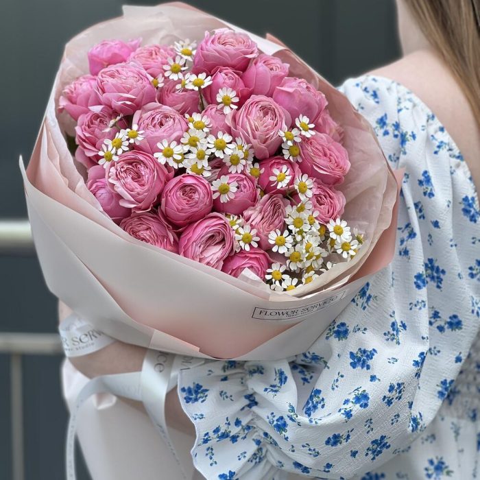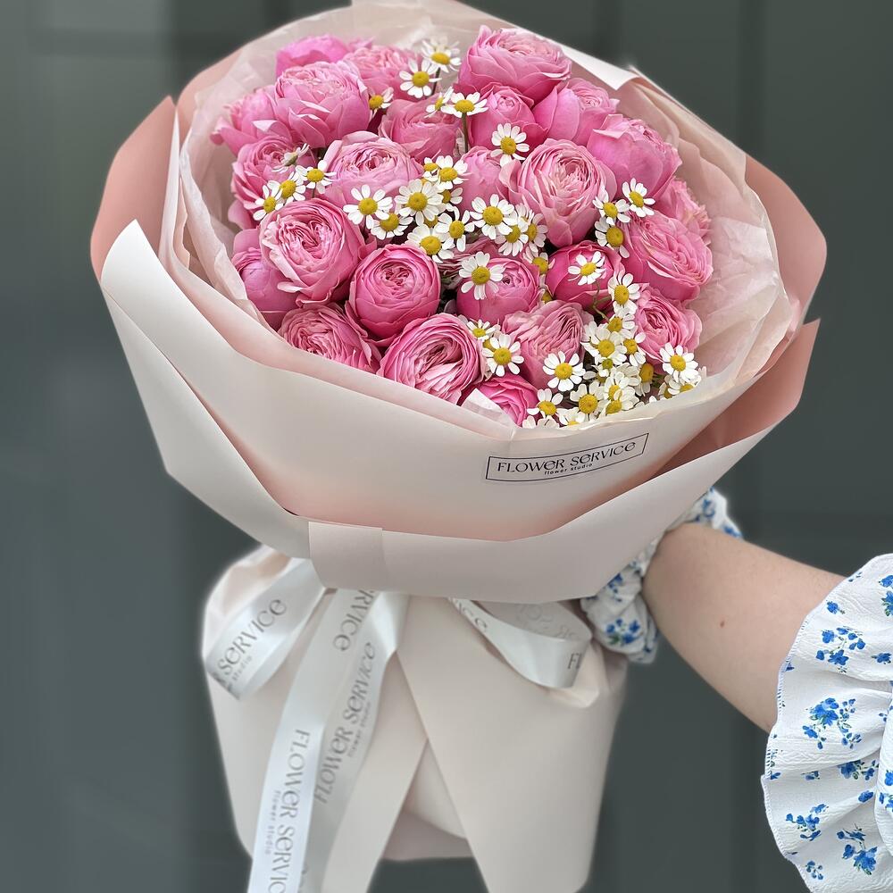 Букет из пионовидных кустовых роз и ромашек в оформлении!