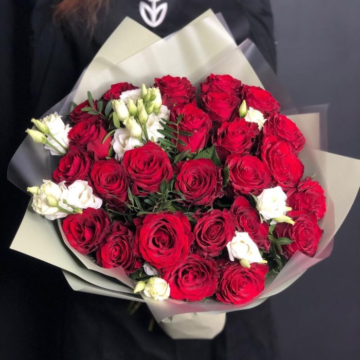 Роза – 25 шт.Эустома – 4 шт.Фисташка пучок – 5 шт.Крафт упаковка – 5 шт.