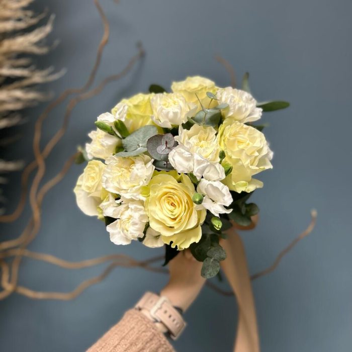 Эвкалипт – 1 шт.гвоздика соломио – 3 шт.Гвоздика – 7 шт.Роза Мондиаль – 5 шт.Лента атласная – 1 шт.
