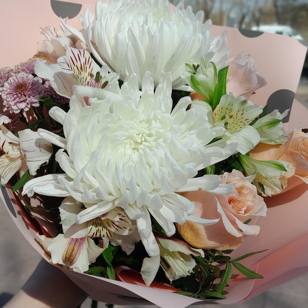 Альстромерия – 3 шт.Хризантема кустовая – 1 шт.Роза – 3 шт.Хризантема – 2 шт.Лента атласная – 2 шт.Фисташка – 2 шт.Упаковка дизайнерская – 2 шт.
