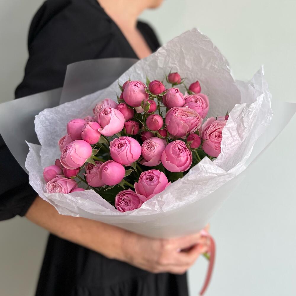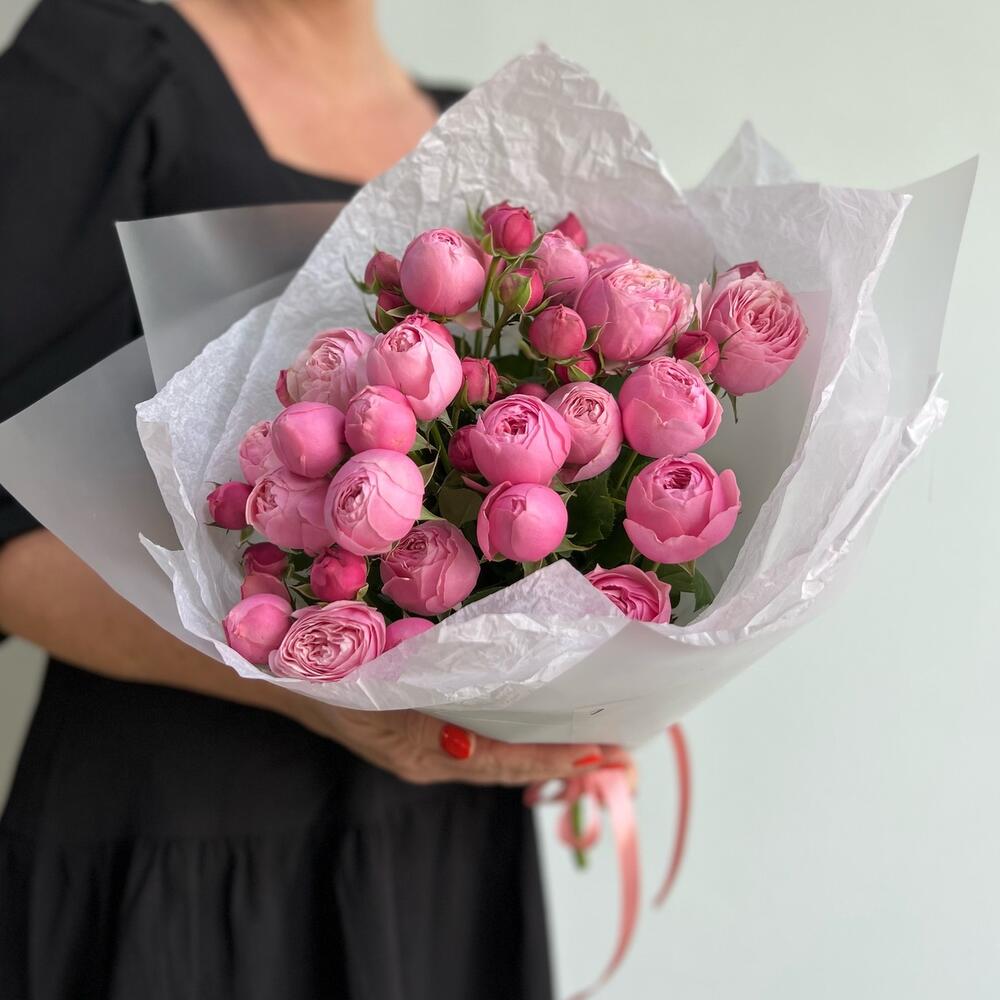 Лента атласная – 1 шт.Пионовидная кустовая роза – 3 шт.Пленка матовая – 2 шт.Тишью белое – 2 шт.