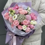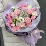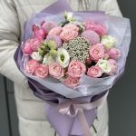 Эустома – 3 шт. Хризантема момоко – 3 шт. Озотамнус – 2 шт. Кустовая пионовидная роза – 3 шт. Кустовая роза Бомбастик – 3 шт. Оформление – 1 шт.
