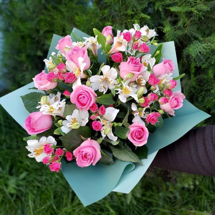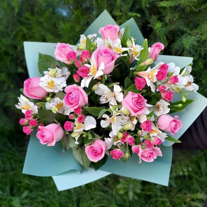 Роза розовая – 11 шт. Альстромерия белая – 5 шт. Роза кустовая розовая – 5 шт. Упаковка матовая пленка – 1 шт.