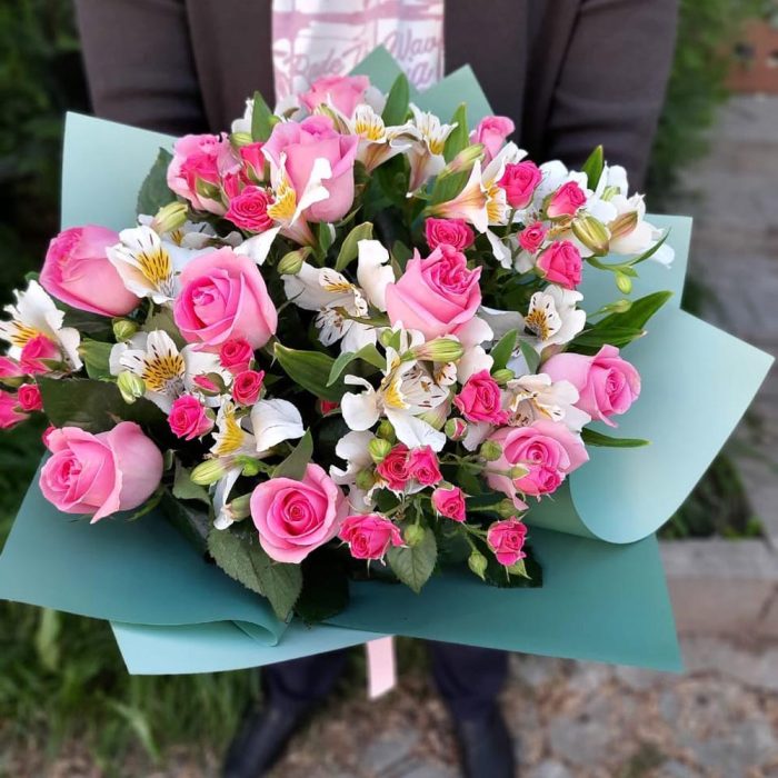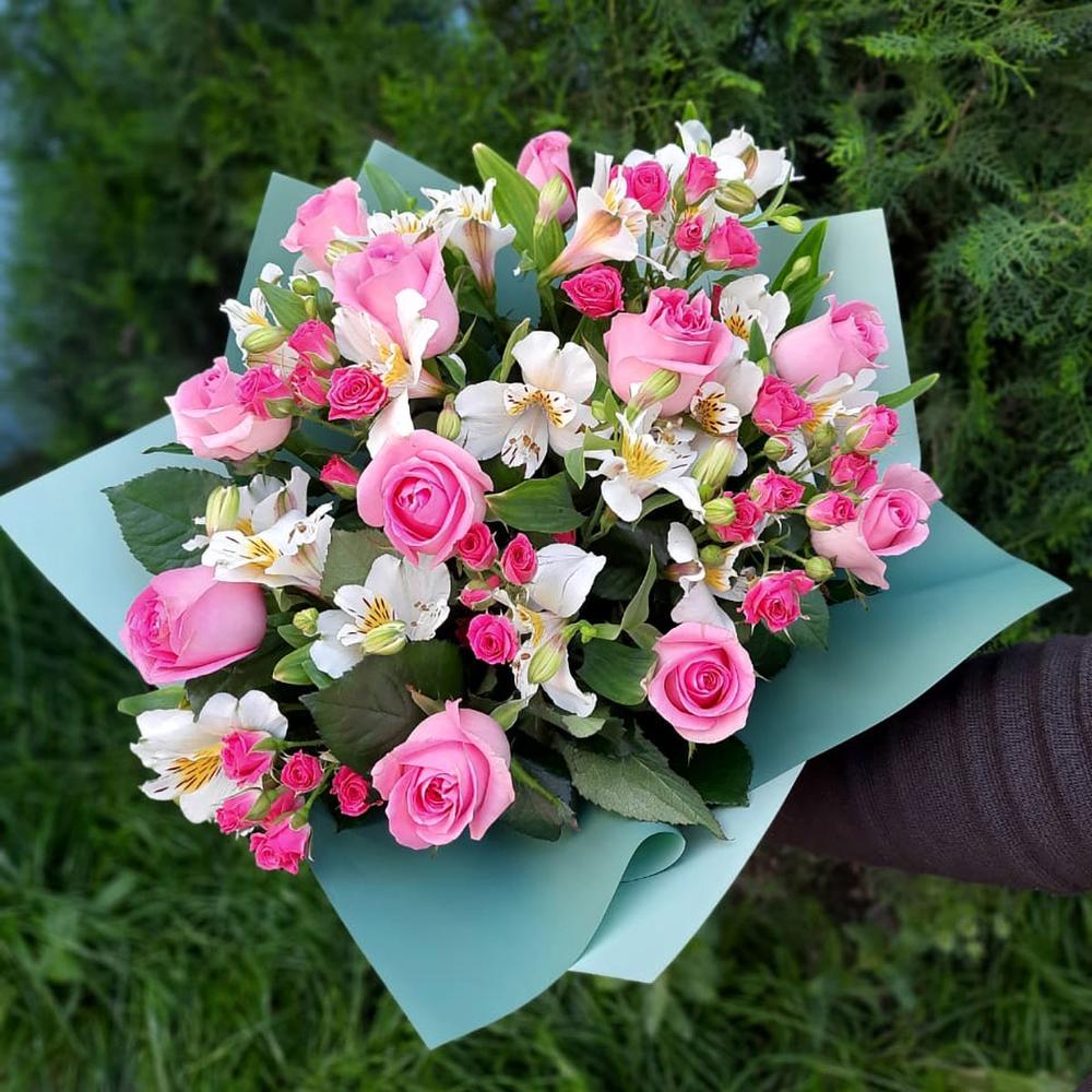 Чудесный букет из розовых роз, белых альстромерий и розовых кустовых роз в стильном оформлении.