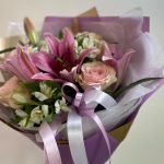 Альстромерия – 5 шт.Роза – 5 шт.Упаковка – 5 шт.Тишью белое – 6 шт.фисташка зелень – 9 шт.ленты атласные – 8 шт.лилия ароматная ветка – 2 шт.