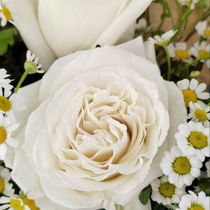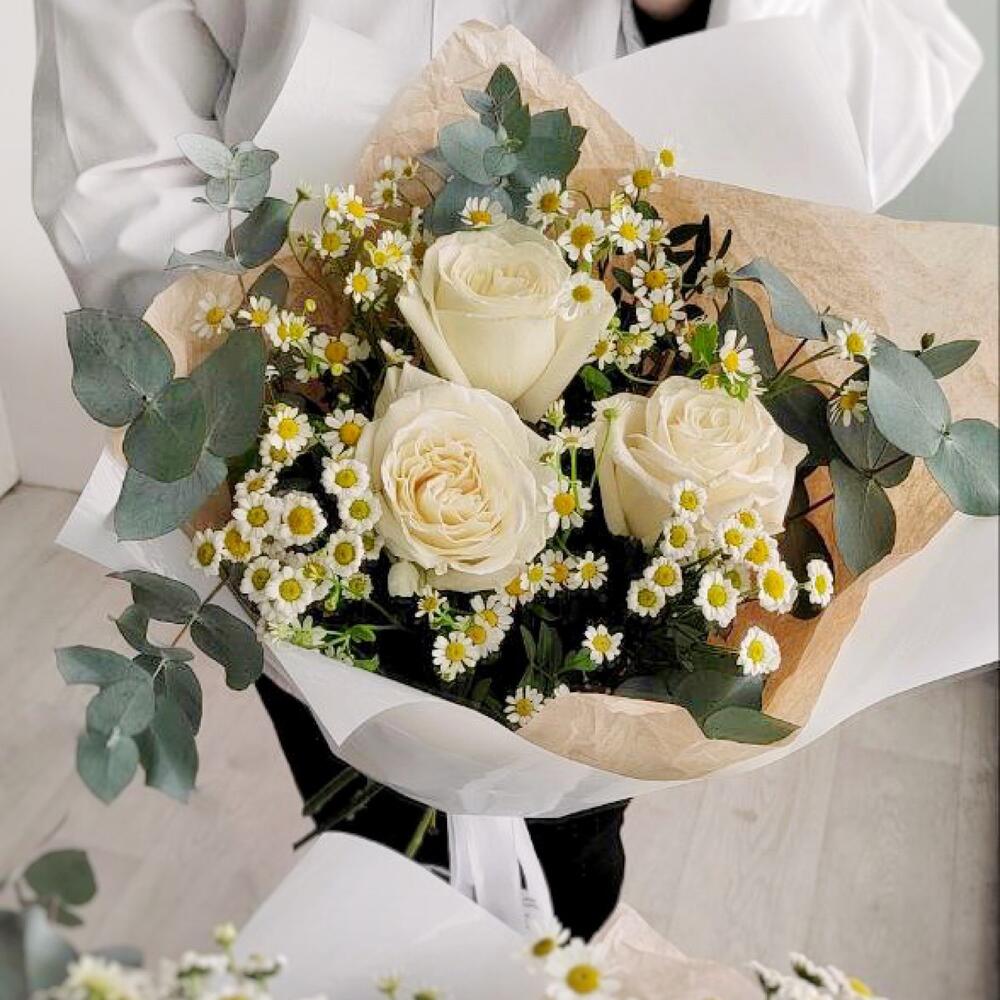 Эвкалипт – 2 шт.Ромашка кустовая – 4 шт.Упаковка дизайнерская – 4 шт.Лента атлас – 4 шт.Роза белая эквадор – 3 шт.фисташка зелень – 3 шт.