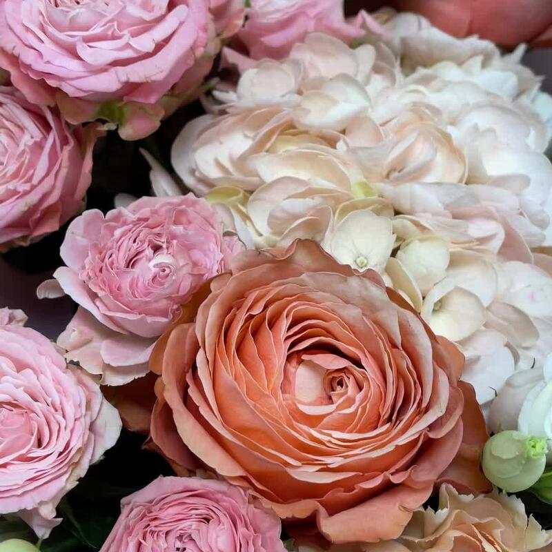 Гортензия – 2 шт.Эвкалипт – 3 шт.Эустома – 3 шт.Диантус – 5 шт.Роза пионовидная – 5 шт.Кустовая пионовидная роза – 7 шт.Упаковка дизайнерская – 4 шт.зелень декоративная – 3 шт.