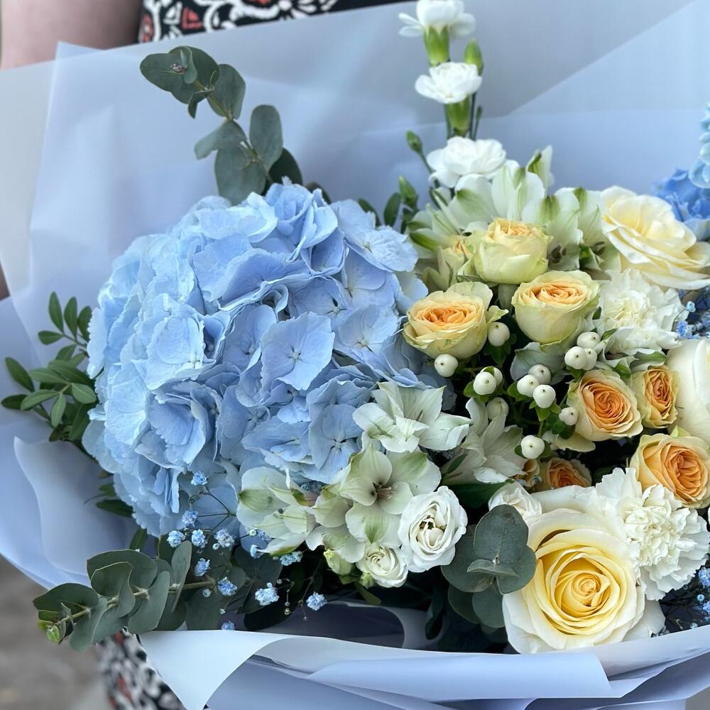 Гортензия голубая – 1 шт.Роза кустовая – 3 шт.Роза Эквадор – 3 шт.Альстромерия – 3 шт.Дельфиниум голубой – 2 шт.Диантус кустовой – 3 шт.Диантус сортовой – 3 шт.лизиаетус – 1 шт.Гиперикум – 1 шт.Гипсофила – 3 шт.Эвкалипт – 3 шт.Фисташка – 3 шт.Упаковка дизайнерская – 3 шт.Лента атласная – 1 шт.