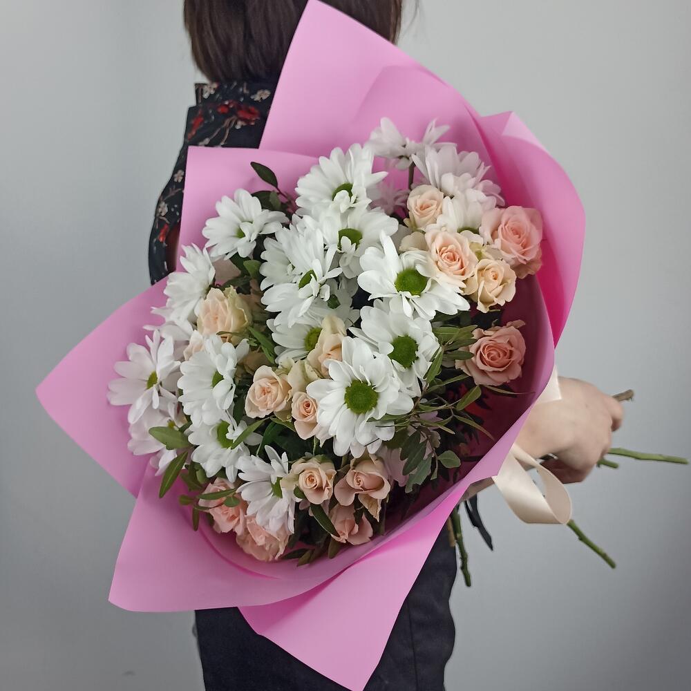 Букет с хризантемами и кустовыми розами