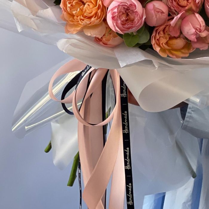 Роза кустовая пионовидная – 11 шт.Эвкалипт – 2 шт.Упаковка дизайнерская – 2 шт.Лента – 2 шт.