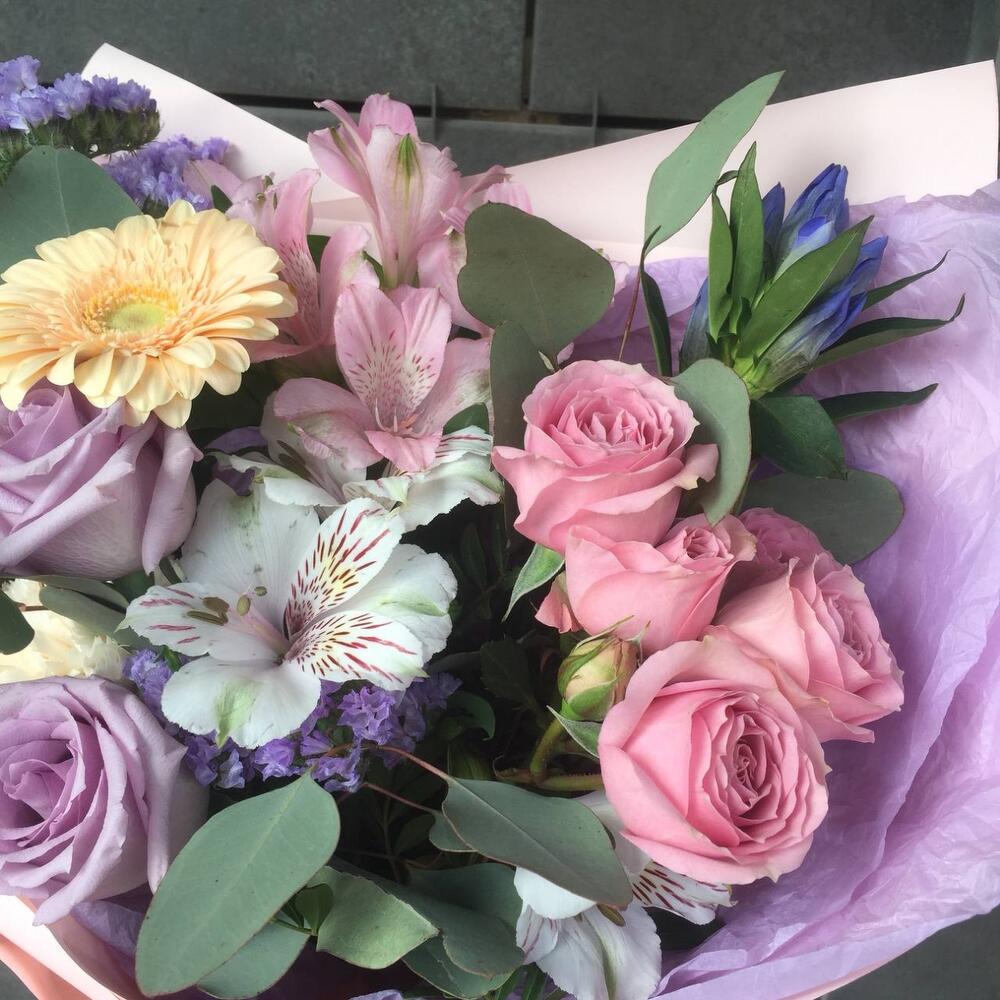 Альстромерия – 2 шт.Роза кустовая – 2 шт.Статица – 1 шт.Эвкалипт – 1 шт.Роза – 2 шт.Гвоздика – 2 шт.Гербера – 1 шт.Гентиана – 1 шт.