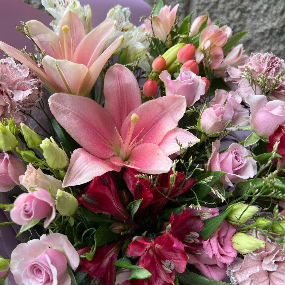 Букет с лилией ,альстромерией,диантусами,эустомой,гиперикумом,кустовыми розами и лимониумом
